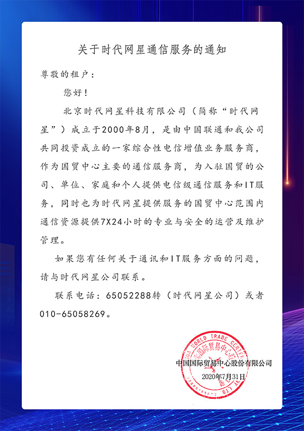 Beijing Times NetStar Technology Co., Ltd. (TNET) was established in August 2000. It is a value-added Internet Service Provider, invested by China Unicom and China World Trade Center. TNET aims at planning, constructing and operating "Smart Park". As a national high-tech enterprise that upholds ISO9000 Quality Management System Certification, ISO20000 Service Management System Certification, and ISO27001 Information Security Management System Certification,TNET provides 7*24 on-site network and IT Butler service for near 1000 international and domestic enterprises, China World Mall, China World Hotel and other Shangri-La Hotels. The business scope covers broadband access, communication business agency, IT outsourcing, system integration, software development and other comprehensive information needs based on "Smart Office". With the help of "TNET Cloud" platform and big data management platform, we provide customers with professional and customizable IaaS, PaaS and SaaS services, as well as cloud video conference, cloud monitoring, cloud patrol inspection, cloud security and other comprehensive application support and management services. TNET has committed to becoming the leading and reliable comprehensive network information service provider. Adhering high level industry service standard, the one of a kind intellectual “Network Expert" & turnkey “IT Butler" service has been recognized as an important part of CWTC & Kerry business services and indispensable functions of any intellectual business circle. Entering the digital era, leveraging our robust digital and intelligent capabilities, TNET is committed to working with you to contribute to the development of smart buildings and deliver high-quality, reliable services to clients.TNET is your trusted NetworkExpert and IT Butler.
