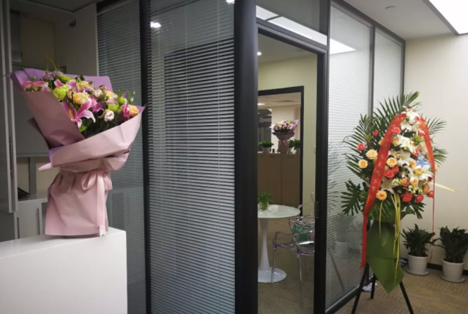 合作伙伴送來花籃表示祝賀 圖片 租區(qū)內(nèi)特地擺放了鮮花,表達(dá)員工們的喜悅心情