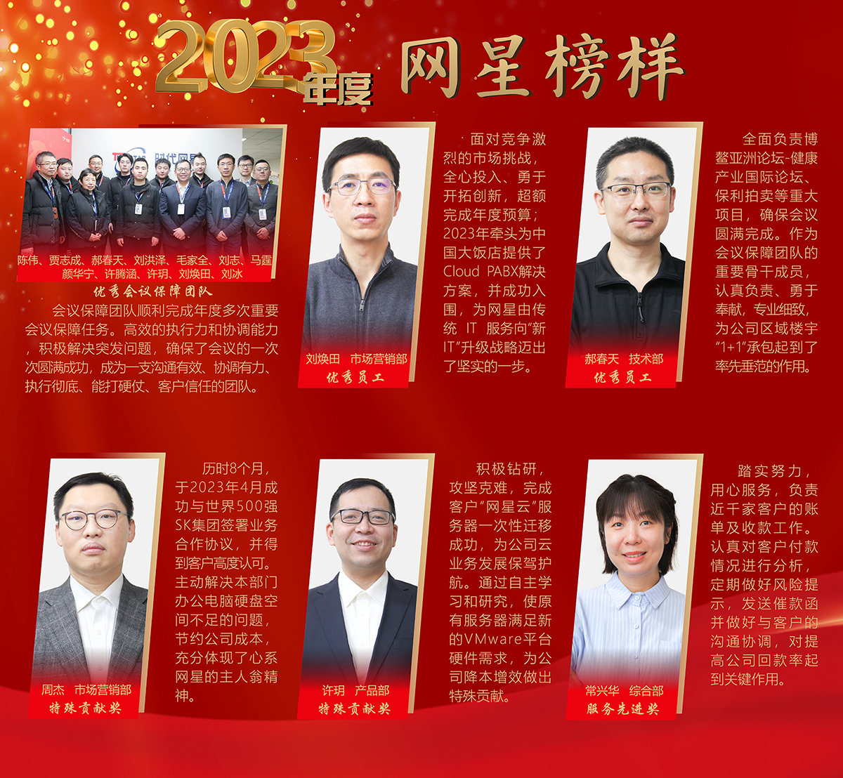 2023年公司按照年初董事長(zhǎng)對(duì)網(wǎng)星工作提出的4點(diǎn)要求和公司“126”工作部署, 一是以數(shù)字化發(fā)展為主線(xiàn),網(wǎng)星的數(shù)字化轉(zhuǎn)型初顯成效,隨著網(wǎng)星數(shù)字中臺(tái)二期的開(kāi)通,網(wǎng)星的所有業(yè)務(wù)均已實(shí)現(xiàn)線(xiàn)上辦公,網(wǎng)星的數(shù)字化技術(shù)越來(lái)越多得到股東單位和客戶(hù)的認(rèn)可。二是在市場(chǎng)開(kāi)拓方面,公司成功與世界500強(qiáng)企業(yè)SK集團(tuán)、國(guó)貿(mào)世紀(jì)公寓等近百家新客戶(hù)簽署業(yè)務(wù)合作。公司會(huì)議保障項(xiàng)目組成功完成博鰲亞洲論壇、博鰲亞洲健康論壇、香格里拉酒店集團(tuán)、保利拍賣(mài)、央視世界杯轉(zhuǎn)播發(fā)布會(huì)等30余場(chǎng)國(guó)內(nèi)國(guó)際重要會(huì)議的網(wǎng)絡(luò)和IT服務(wù)。三是在服務(wù)方面,公司圓滿(mǎn)地完成哈薩克斯坦、新加坡、馬來(lái)西亞、蒙古國(guó)和一帶一路會(huì)議等多國(guó)政府的網(wǎng)絡(luò)IT駐場(chǎng)技術(shù)保障工作,并得到了客戶(hù)的高度認(rèn)可。四是在組織建設(shè)方面,公司積極倡導(dǎo)“信任溝通,創(chuàng)新進(jìn)取”的企業(yè)文化,年初公司全員評(píng)選并張榜公布的“我為群眾辦實(shí)事”4項(xiàng)清單全部逐一落實(shí)完成,每年暑假開(kāi)展員工和客戶(hù)的親子日活動(dòng),將企業(yè)文化建設(shè)和黨建工作相融合,不斷增強(qiáng)廣大員工的獲得感、幸福感、安全感!多場(chǎng)景積極踐行國(guó)貿(mào)黨委提出的“三個(gè)一”團(tuán)隊(duì)建設(shè)理念和“六愛(ài)”教育。