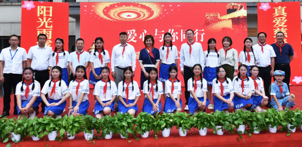 陸遜副書記、郎寬副書記、廖順雨名譽校長、梁超書記、丁志成副局長、國貿(mào)小學譚政校長及石埡村師元明支部書記共同為學生代表派發(fā)了校服、零食禮包及體育用品。
